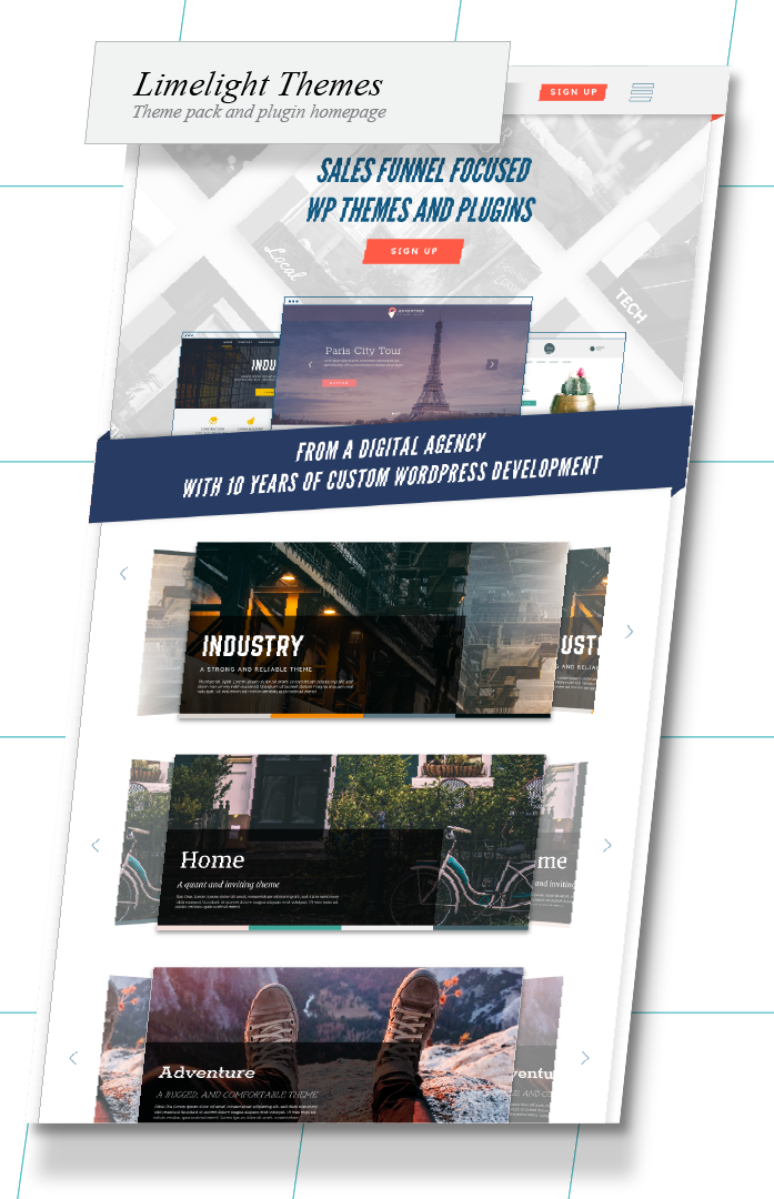 For this project I worked closely with Limelight Dept. Director, Shaylor Murray, and Lead Developer, Jessie Robins, to create a theme pack to coincide with the release of Limelight Theme, a page editor plug-in for Wordpress. This was a great project, which relied heavily on scalability and modular design. We were very pleased with how the release themes turned out!